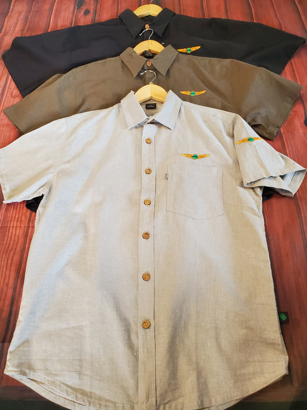 FHC Hemp Button Shirt's are great quality hemp and organic cotton blend. Hemp products have high resistance to bacteria and mildew, which makes them great for work, night out on the town, or hanging out at your local brew-house or dispensary. Available in Black, Army Green, or Light Grey. Need custom employee clothing or customer promotional gear let us know.