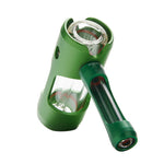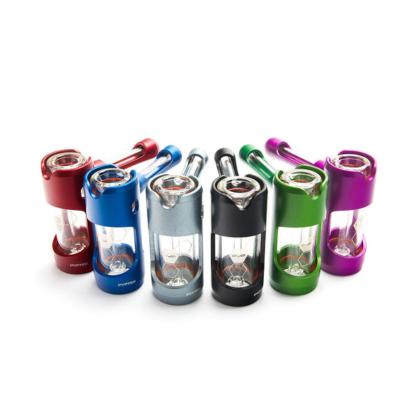 Staying true to PYPTEK’s vision of all glass products and their signature aluminum exoskeleton design, the PYPTEK Bubbler recently joined the full collection. Hello, Bubbler. With large viewing windows to display rapid bubble action you can easily judge the smoke levels. An additional viewing window allows you to keep an eye on your bowl. A big carb lends effortless control of the air/smoke mix and an insert with Purr Glass’s showered percolator, the product leaves no corner unturned. The showered percolator means more bubbles and smoother hit. You’ll have the style, durability, portability in a PYPTEK piece like none before. It’s the largest bowl of any of our pieces. It has a platinum baked on label ensuring cleaning doesn’t tarnish the aesthetic of this piece and also speaks to the luxury it hands out with every hit. It’s designed with dual stance so it can stand up on its base or it can be tipped over at an angle.